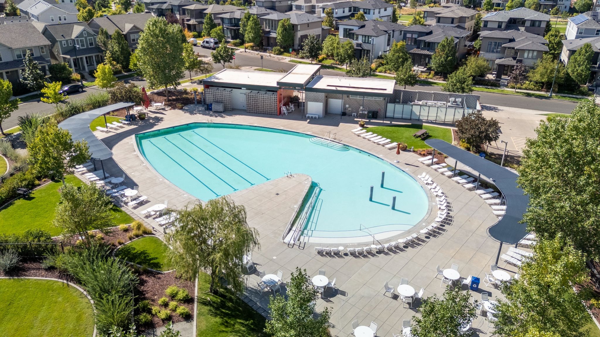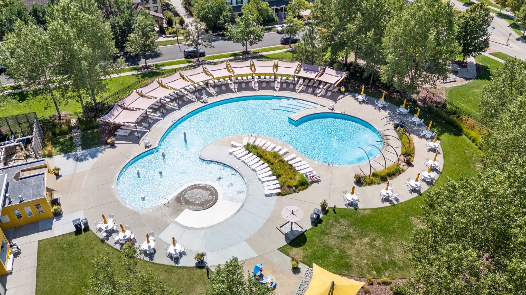 The ultimate spot for fun with little ones! The Puddle Jumper pool in the South End of the neighborhood offers splash features, bubble jets, and a spiraled zero-entry in the shallow end. A big spray waterfall area adds excitement to the deeper end. There are play structures in the park to the west for fun outside of the water. Depending on the swim lessons schedule, this pool can be a great place to get in a swim session before that coveted naptime.