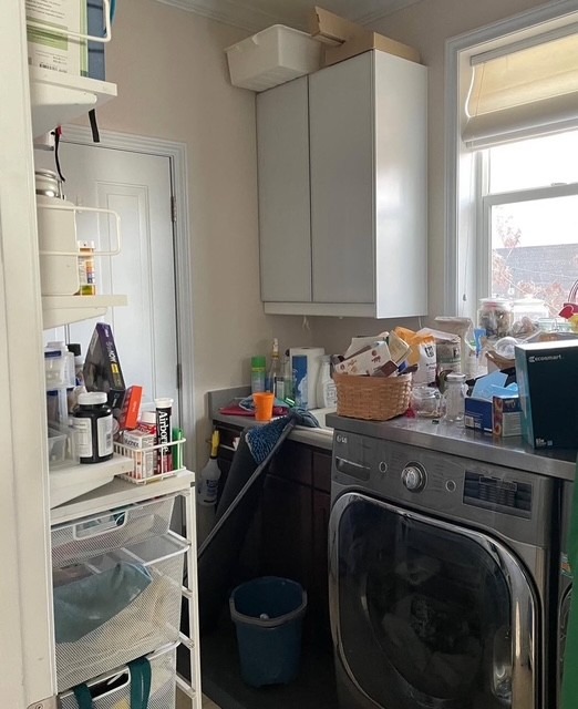 “Stack the washer and dryer and move the machines away from door swings if possible. Add custom storage for brooms and detergent and to hide dirty laundry! And add new lighting and flooring.”