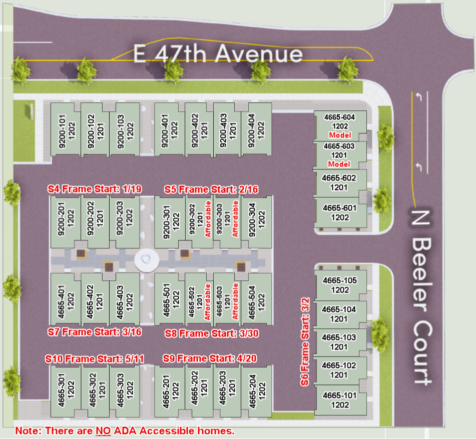 The initial release sits along East 47th Avenue and North Beeler Court and includes a mix of interior and end residences, plus a small number of income‑restricted “affordable” homesites within the community. Construction is phased (S4–S10 on the builder’s map), so you can choose between earlier move‑in opportunities and homes that will deliver later in 2026, depending on your timeline.